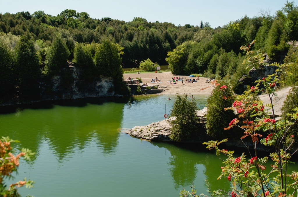 The Elora Quarry is a former limestone quarry turned into a picturesque swimming hole with clear, turquoise waters. The quarry’s deep water and sandy beach make it a popular swimming spot throughout the summer.
