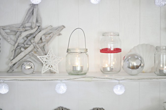 Let your holiday decor reflect your own personality.  Using driftwood stars was only the start of this coastal inspired theme.  I found this on a beach cottage blog and was determined to try the tealights in the clear glass jars.