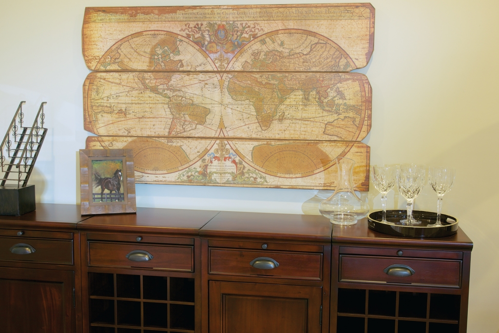 The world map adds charm to this dining room and serves as reminder of places you’ve been or want to visit.