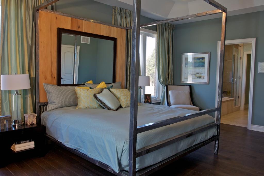 Adding a mirror fills the void in the blank space above the four-poster bed at Forest Trail Estates.