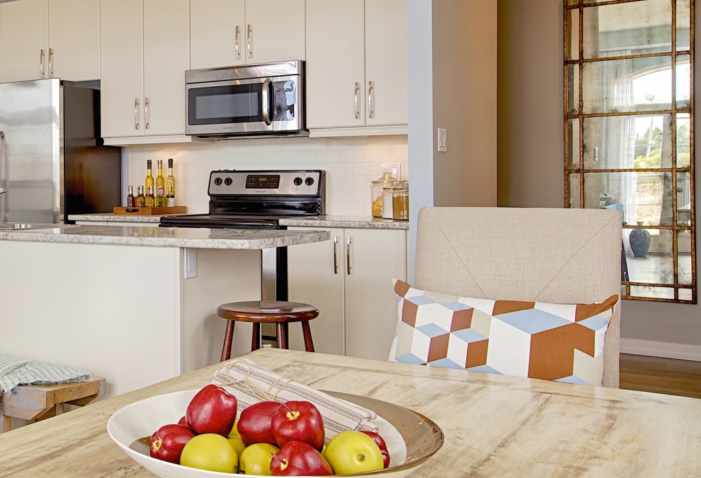 The full-length mirror complements this light-filled open concept space at Uptownes.
