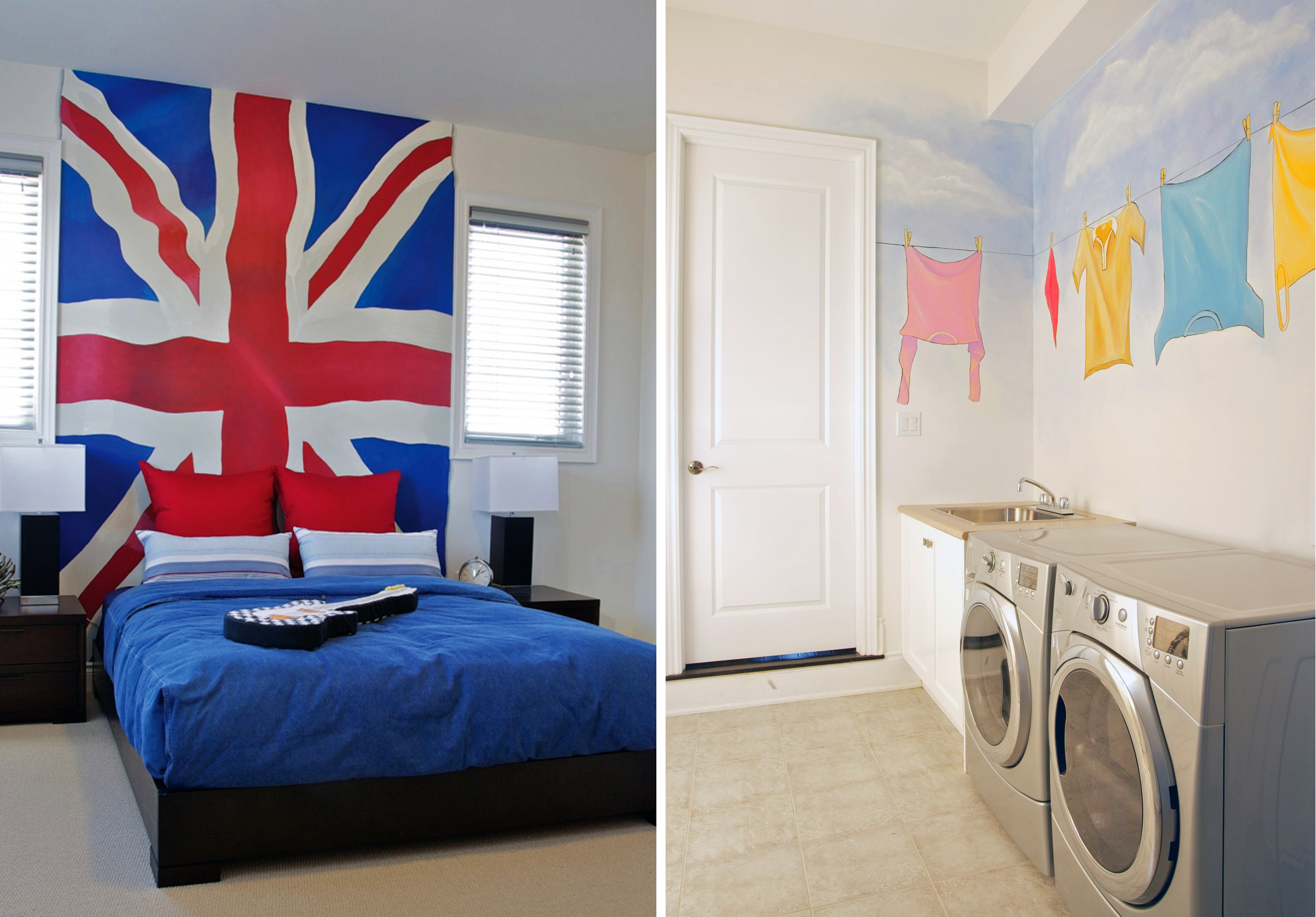 TransformBlankWalls Published August 15, 2017 at 2430 × 1694 in Four Ways to Dress Up Blank Walls ← Previous Next → The Union Jack flag serves as the focal point in this Britannia-themed guest bedroom, while the painted clothesline adds a touch of whimsy to this laundry room from Geranium’s Forest Trail Estates