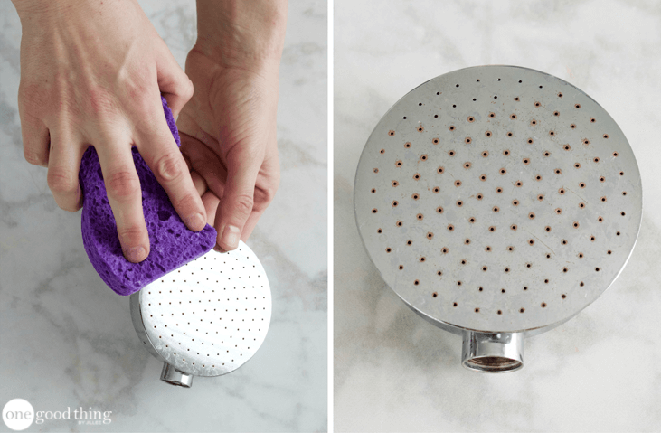 You can dissolve showerhead buildups with vinegar, via One Good Thing