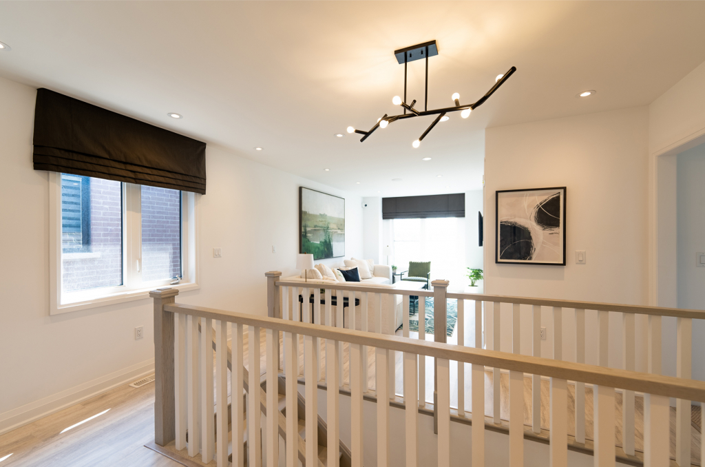 Pot lights are a great choice for hallways, family rooms, kitchens, and anywhere you’re looking for an even distribution of light. “In this hallway in our Hemlock model, the fixture hangs down from the ceiling for interest, however not too far to obstruct views,” Jo-Ann points out, “natural light floods in through the large windows.”