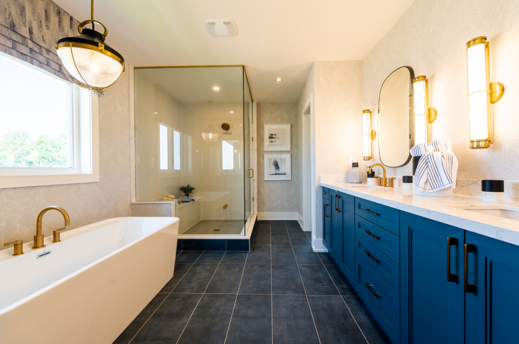“When it comes to your bathroom,” Jo-Ann explains, “opt for side lighting near vanities for optimal grooming and makeup application and maintain even spacing to harmonize with accent lighting. A chandelier can provide accent lighting and serve as a focal point above a bathtub, offering an intimate atmosphere for a luxurious soak.”