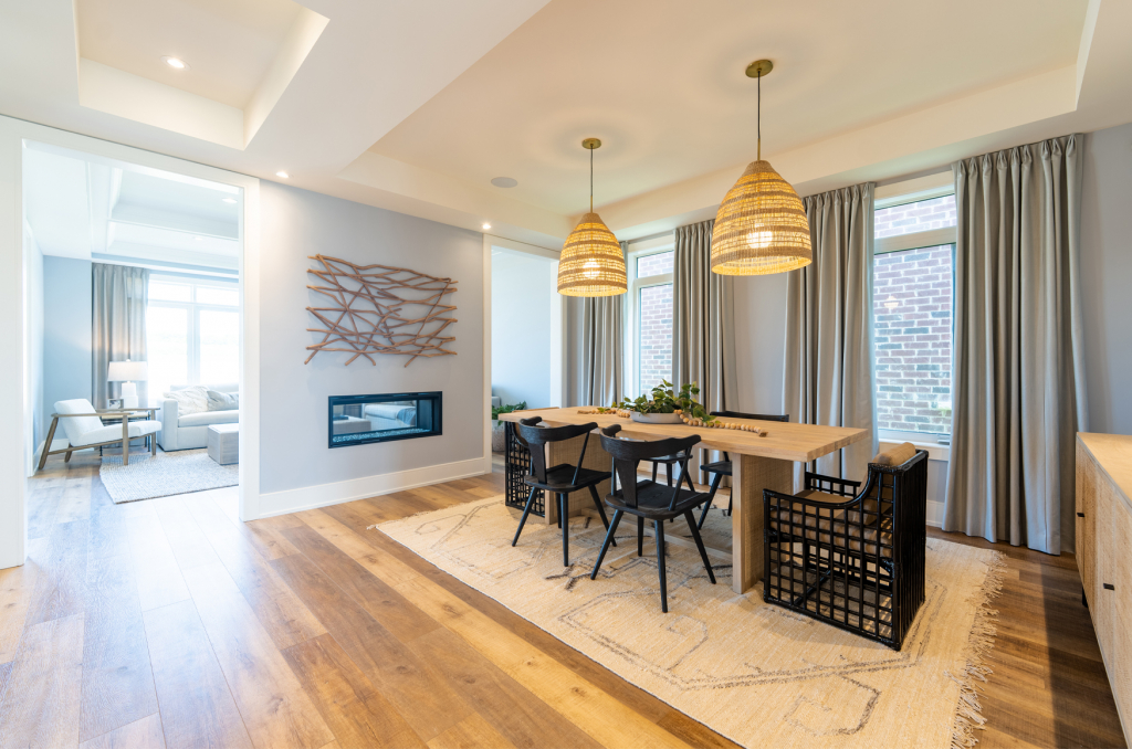 The kitchen area should be well lit and have dimmers for adjusting light levels based on tasks or ambiance needed. “In the Hemlock model at Midhurst Valley, pot lights provide general lighting, valance lights serve as task lighting, while pendants provide the accent necessary for above the island,” explains Jo-Ann. Under-cupboard lighting is another form of task lighting in a kitchen, providing much-needed illumination to essential food prep areas.