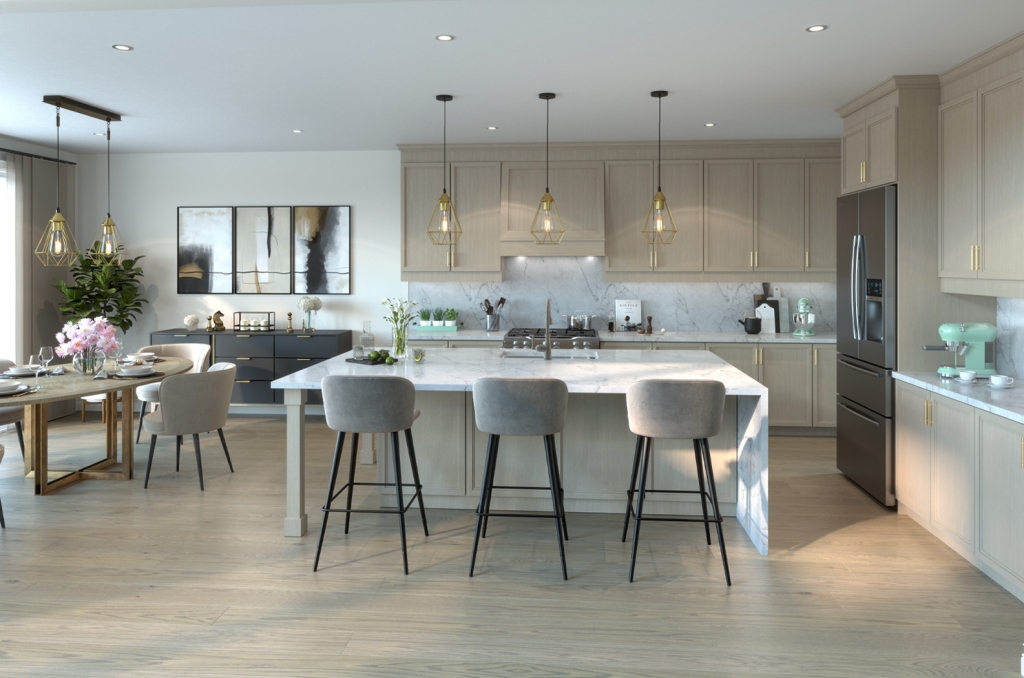At Midhurst Valley, contemporary kitchens with quartz islands and generous counter space make it easy to lay out food, mix drinks, and keep the evening flowing effortlessly.