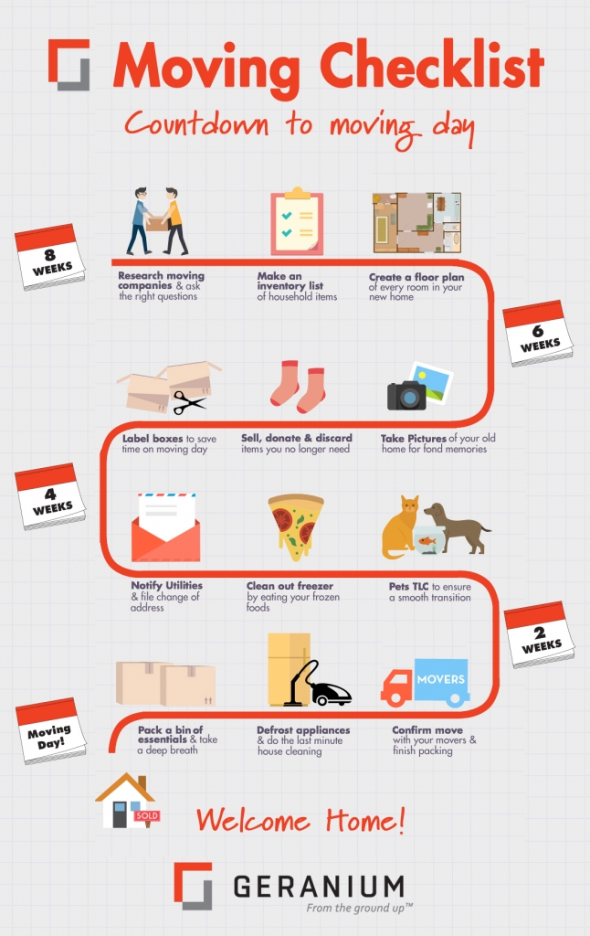 Congratulations on the purchase of your new home! You’re ready to start a new chapter in your life! Moving to a new home is so exciting – a chance to declutter and start fresh. At Geranium Homes, we’ve had the opportunity to share in the joy of moving into a new home with more than 8000 families. And we’re pleased to share a simple checklist of useful tips that will help make moving a smoother transition.