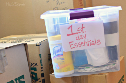 Put together a bin filled with things you’ll need immediately after you move in. You can include things like: garbage bags, scissors, wet wipes, paper towels, toilet paper, paper plates/cups, plastic forks, knives and spoons and don’t forget the soap, hand and dish soap. Place this bin in the car, that way you have immediate access to it once you’ve arrived at your new home.