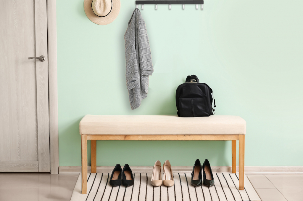 Install hooks or shelves near the entry door for a place to hang coats, hats, and bags. Add a small shoe rack or boot tray to organize shoes and prevent dirt from being tracked into the house.