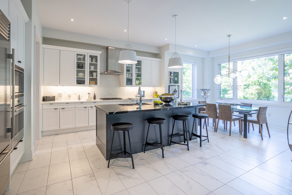White paired with a darker island creates a stunning effect in this Allegro kitchen