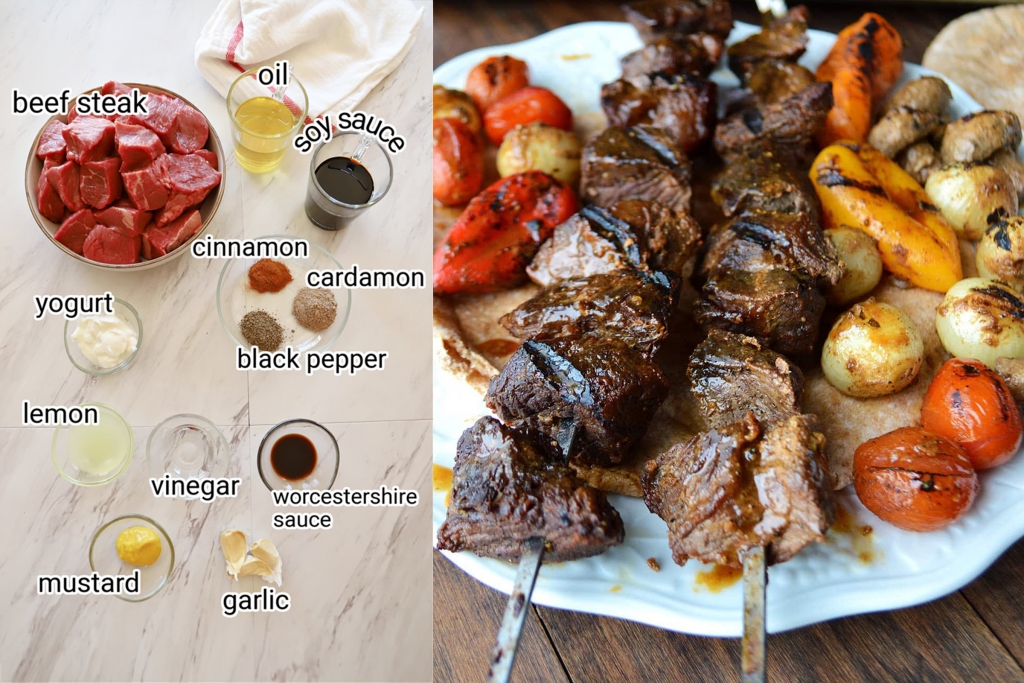 This easy-to-make recipe is anything but boring, using a delicious marinade of lemon juice, vinegar, mustard, yogurt, and the middle eastern staples of garlic, black pepper, cardamom, and cinnamon, to make even the most economic cut of beef tender and tasty.