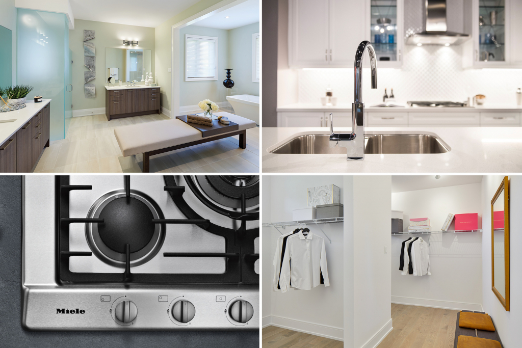 The exceptional level of standard luxury features and finishes at Allegro is one of the things that sets these residences apart from other communities. Main floors feature oak hardwood flooring and soaring 10’ ceilings with dramatic coffered detailing. Lavish kitchens include standard walk-in pantries and serveries, granite or quartz counters, custom cabinets and a fabulous 6-piece Miele appliance package. Master bedrooms feature spacious walk-in closets, spa-inspired ensuites with rectangular freestanding tubs and extra-large frameless glass showers with marble seats.