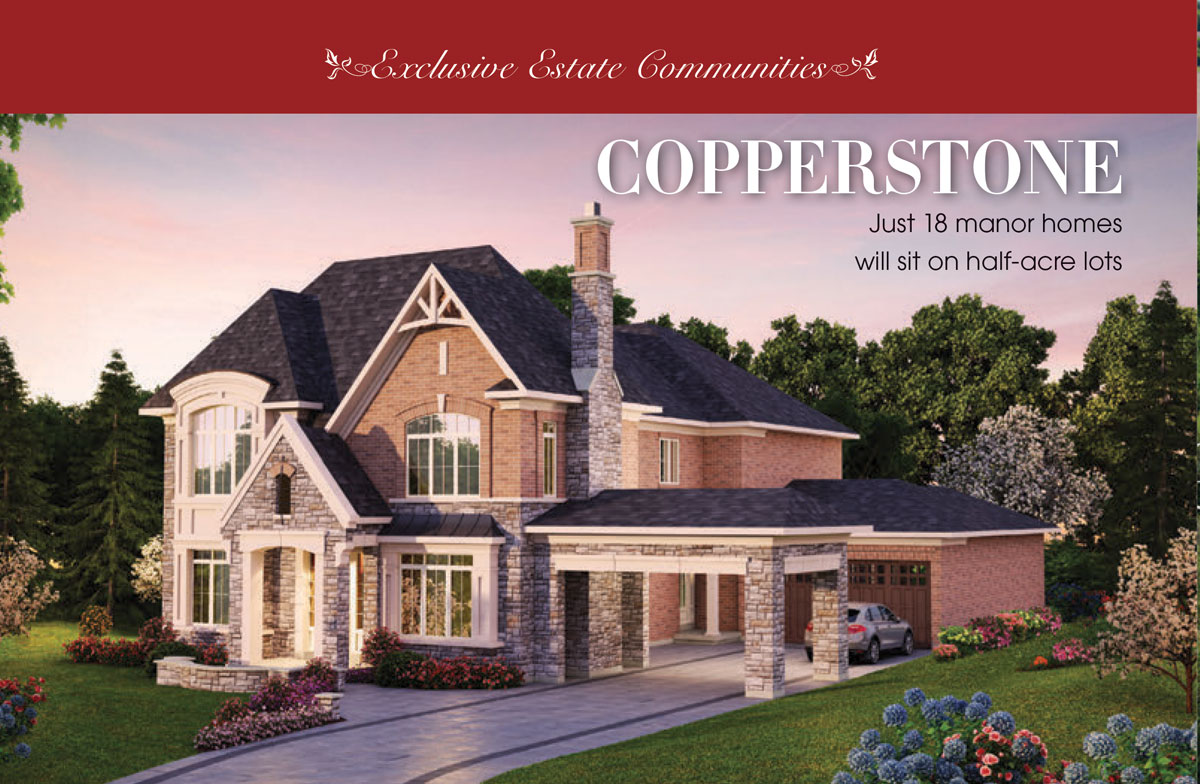 bordering mature trees, Copperstone will be an exclusive enclave of just 18 manor homes on estate lots of approximately half an acre. A short walk to scenic Musselman’s Lake, Copperstone is also minutes to many prestigious golf courses, equestrian centres and the comprehensive urban amenities in Aurora and Stouffville.