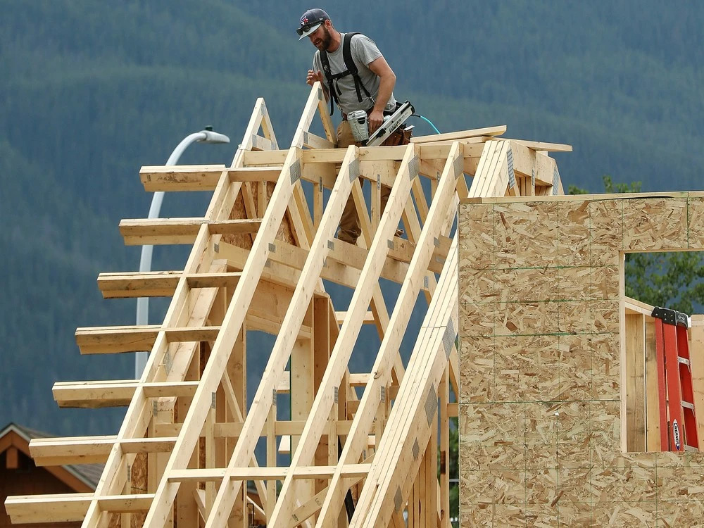 Construction crews work on a new home in Jasper, Alta. Photo by David Bloom /Postmedia