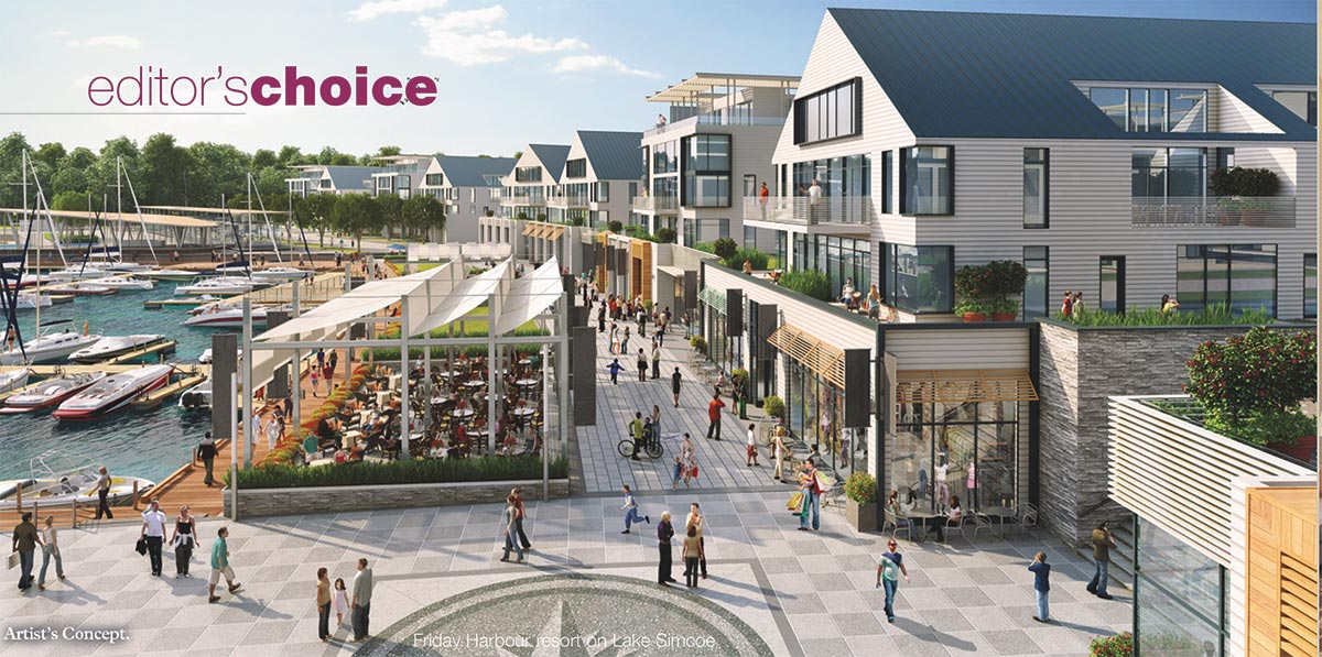 Friday Harbour will become one of Ontario’s premier waterfront resorts on Lake Simcoe’s protected Big Bay Point in Innisfil. Friday Harbour encompasses 600 acres, and will have all the key ingredients for year-round relaxation and recreation. The resort is just an hour’s drive from the GTA and accessible by GO Train. Friday Harbour will feature an 18-hole championship golf course, seven kilometres of trails within the 200-acre nature preserve, and a lakefront pedestrian village with boutiques and restaurants that is sure to become Simcoe’s new all-season destination for fun and leisure. A Performing Arts Centre will add to the entertainment program