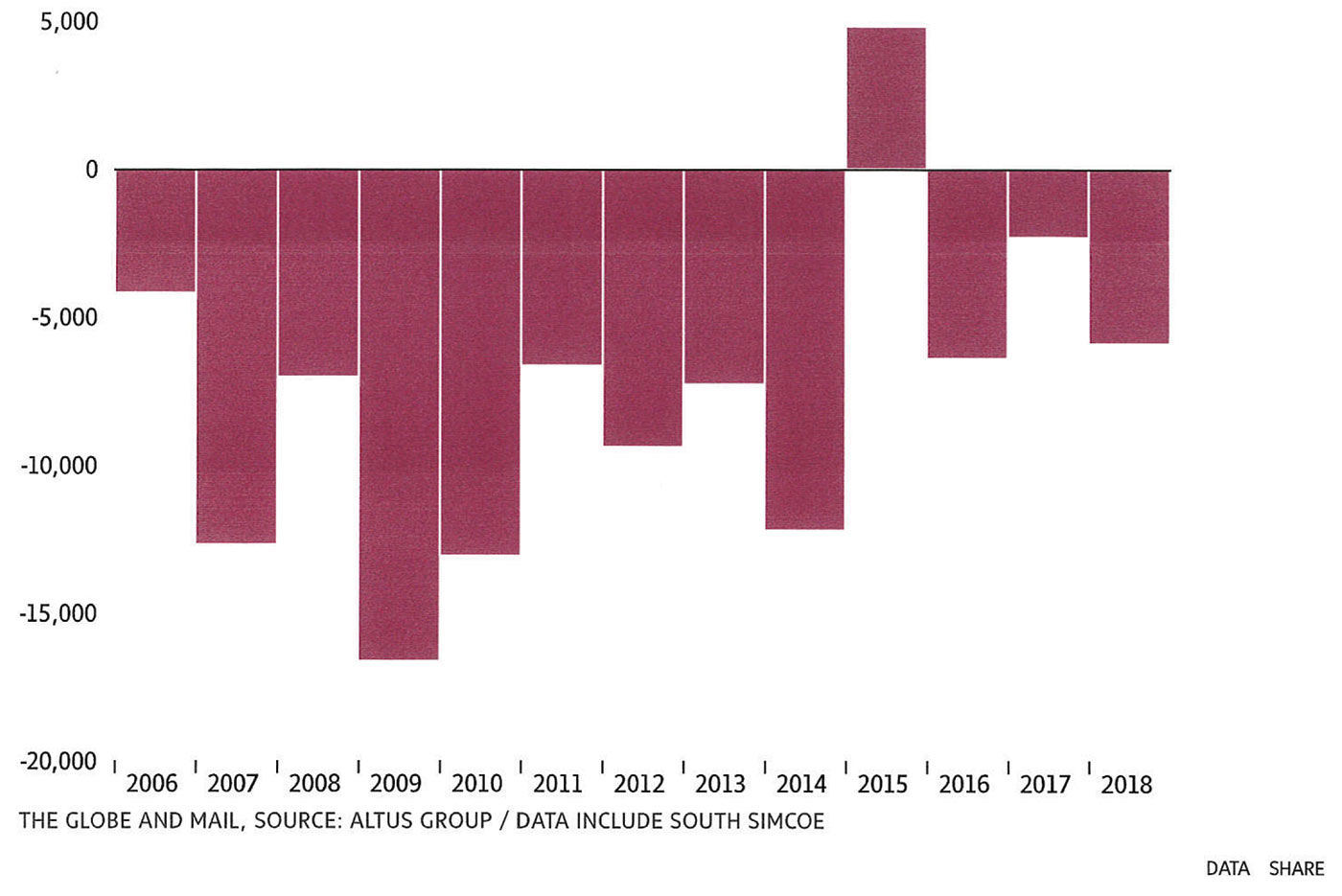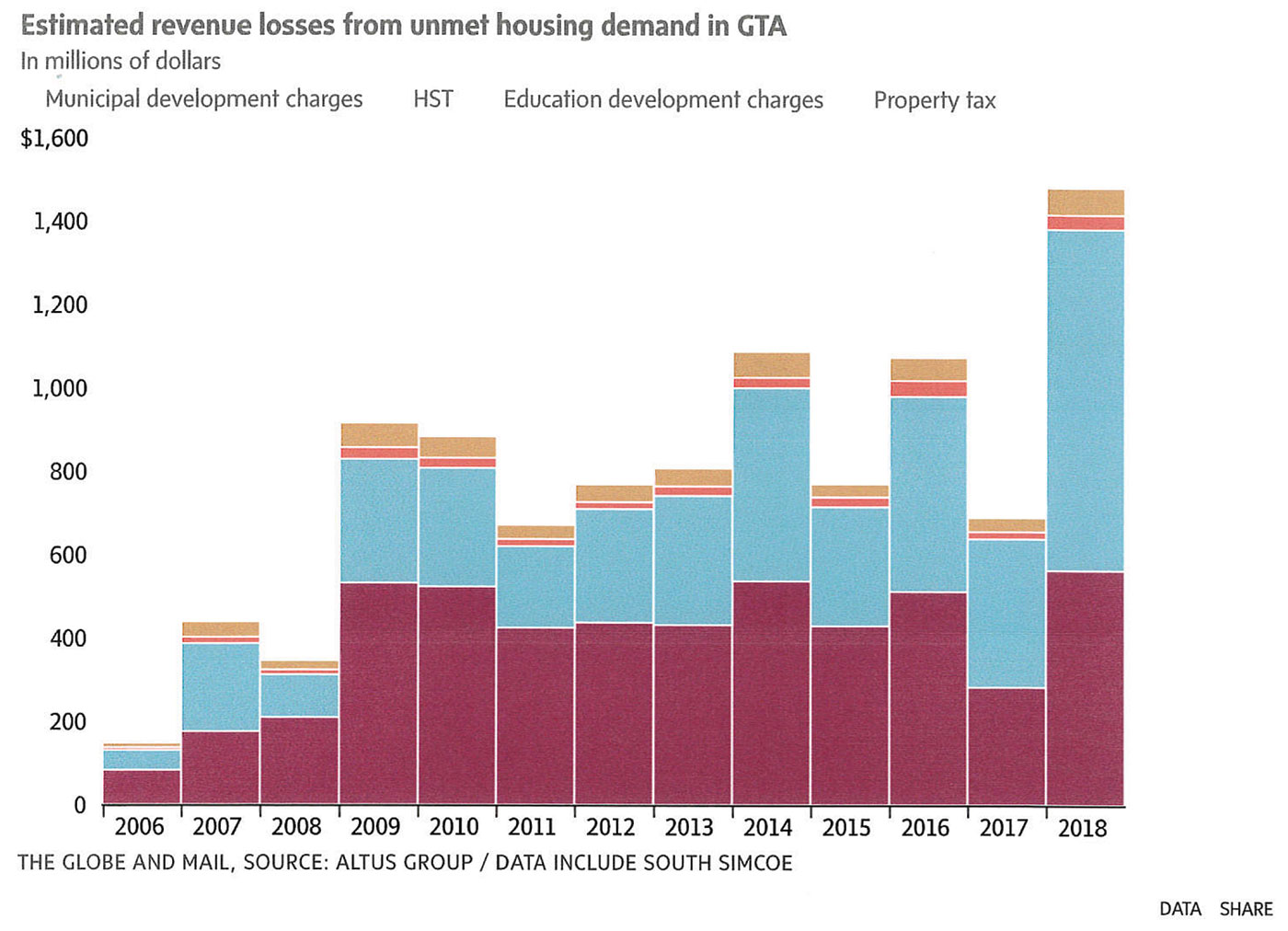 Altus Group said if the construction shortfall continues over the coming decade at the same pace as the past five years, there will be an annual average construction shortfall of 4,400 units between 2019 and 2029, which would translate into a further $13-billion in missed government revenue from municipal development charges and tax revenue.