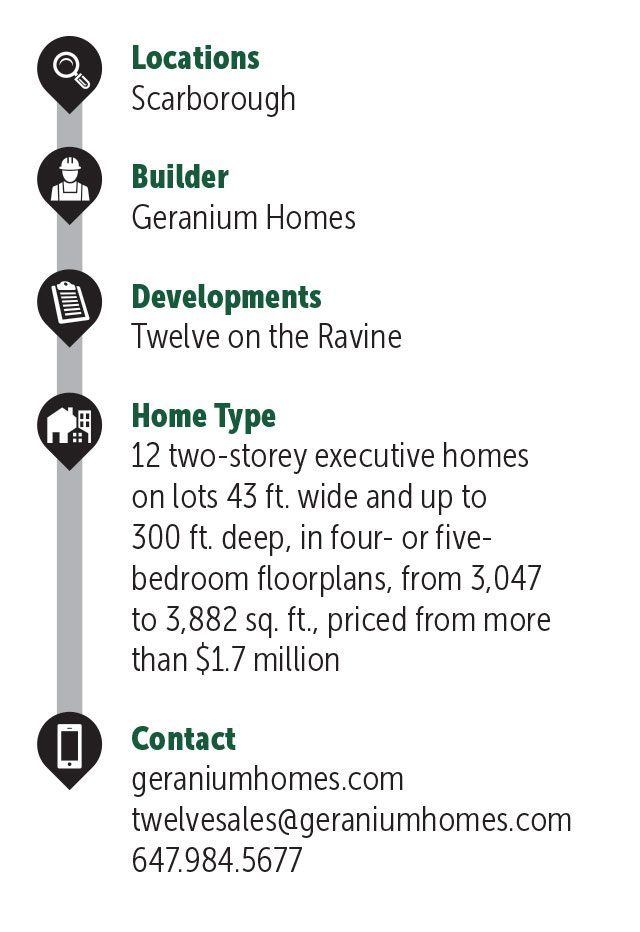 Geranium’s Green Plus and behind-the-walls construction ensures a long lasting well-built home. Visit geraniumhomes.com/twelveontheravine for further information. Sales by appointment e-mail twelvesales@geraniumhomes. com or call 647.984.5677